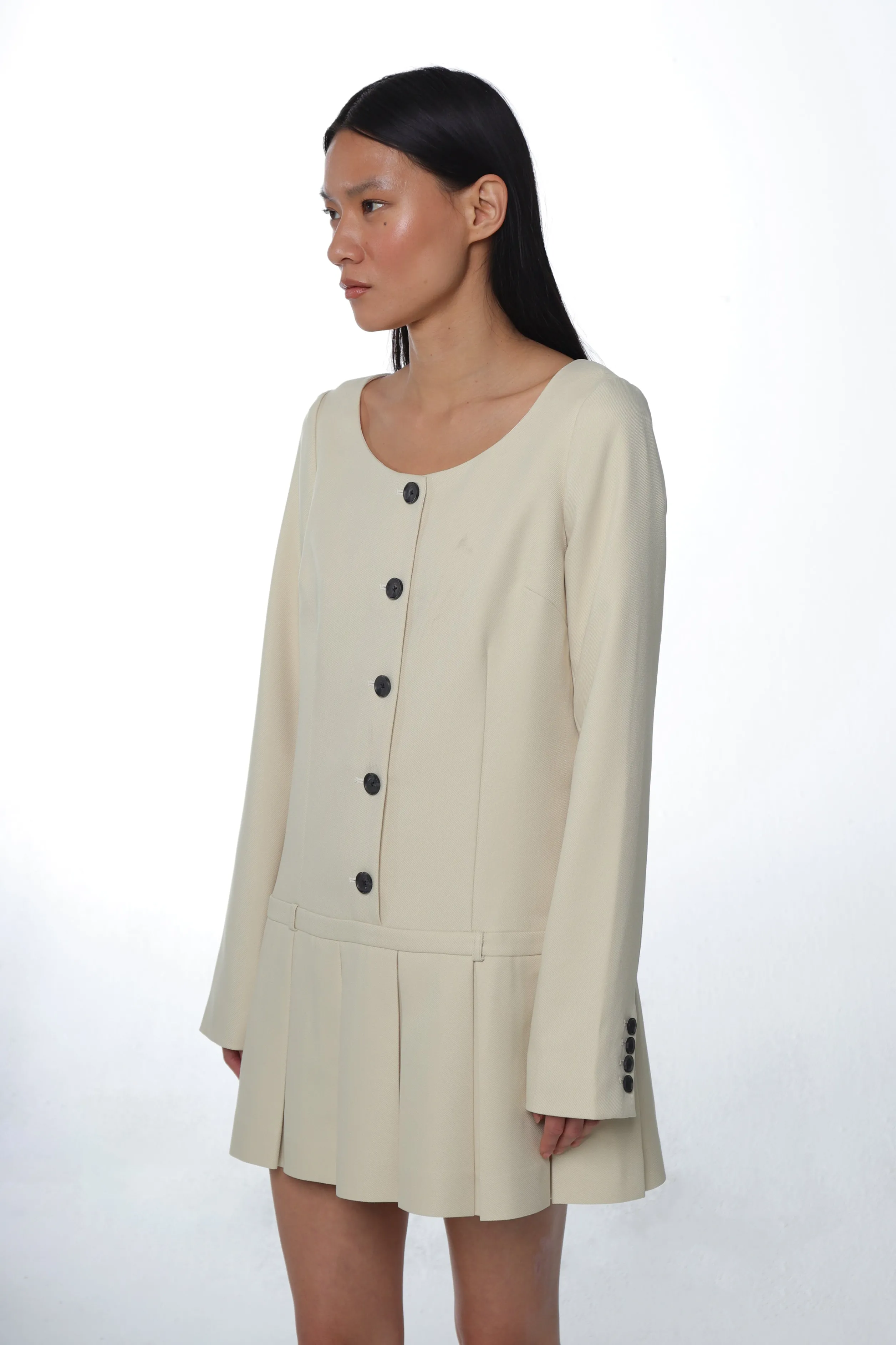 Pleated mini dress in ButterScoop neck and contrast buttonsConcealed zipper at sideseamMade in NYC