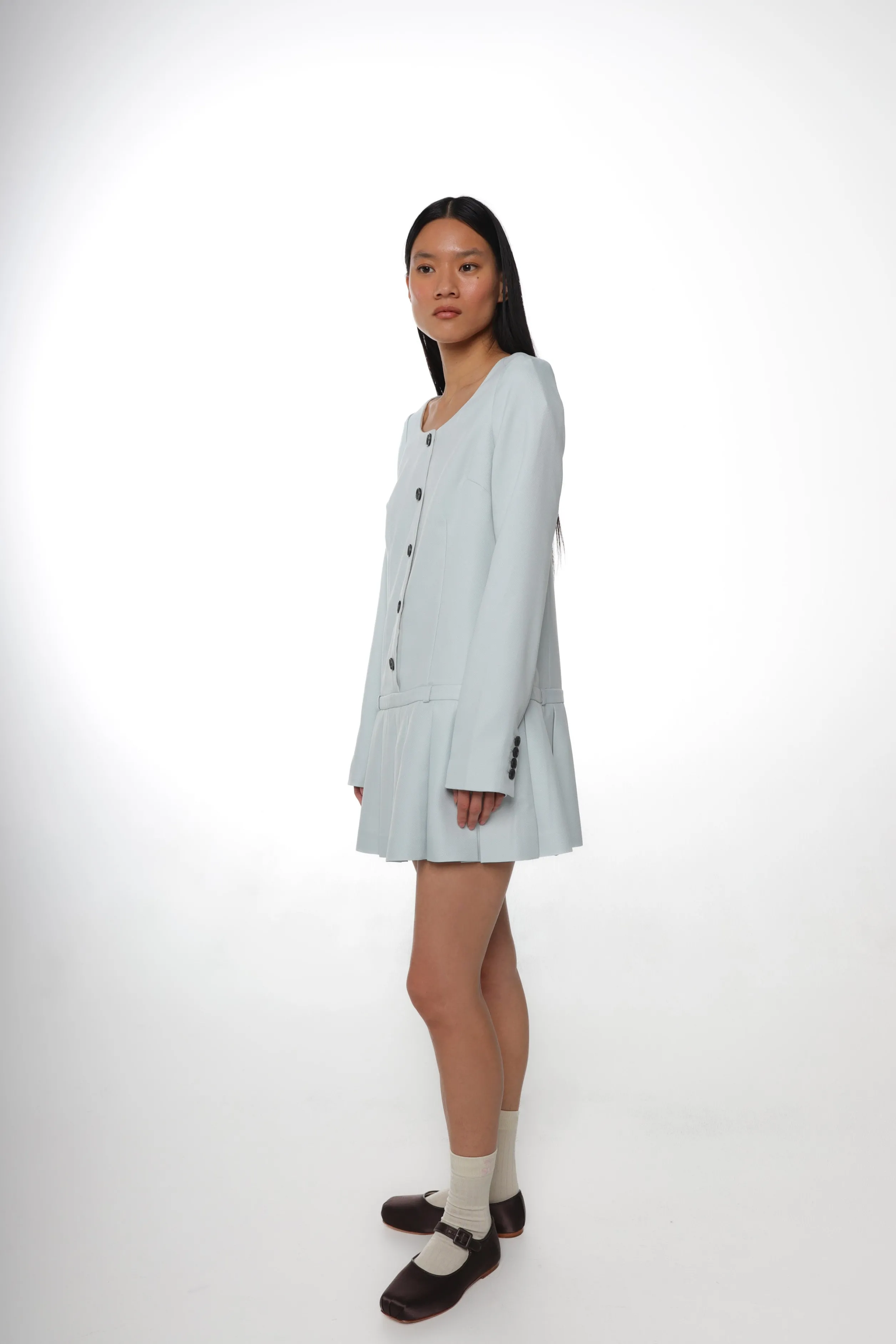 Pleated mini dress in Ice BlueScoop neck and contrast buttonsConcealed zipper at sideseamMade in NYC