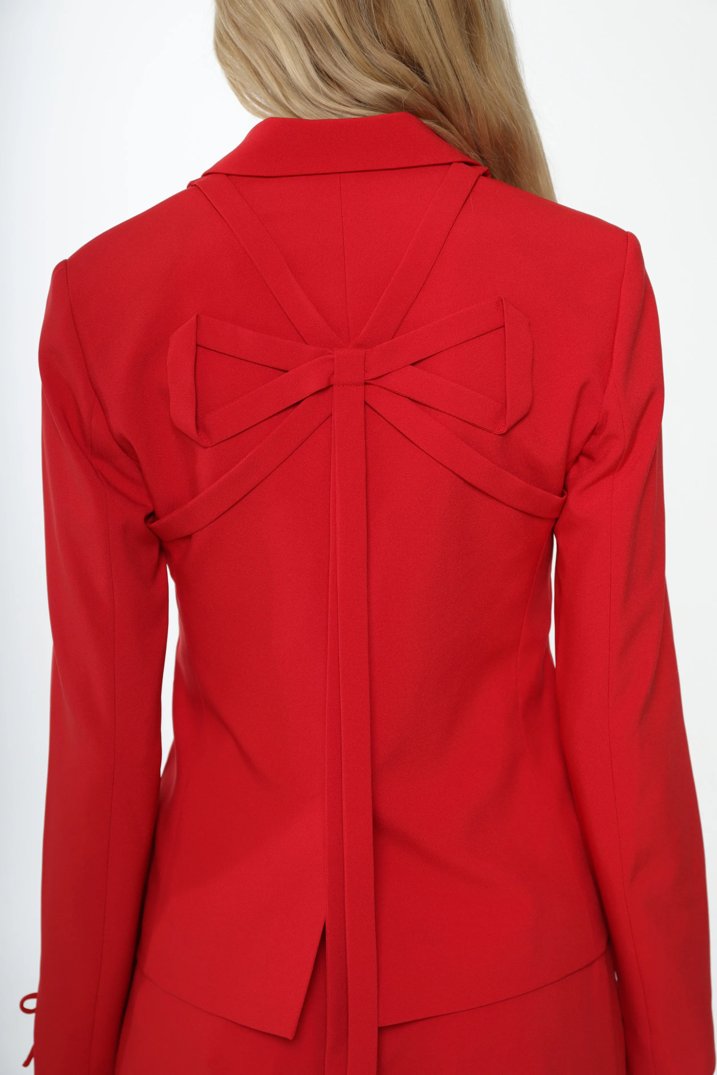 Tailored jacket in Red suiting Features bow strap details in backBow and logo detail at cuff Fully lined Made in NYC
