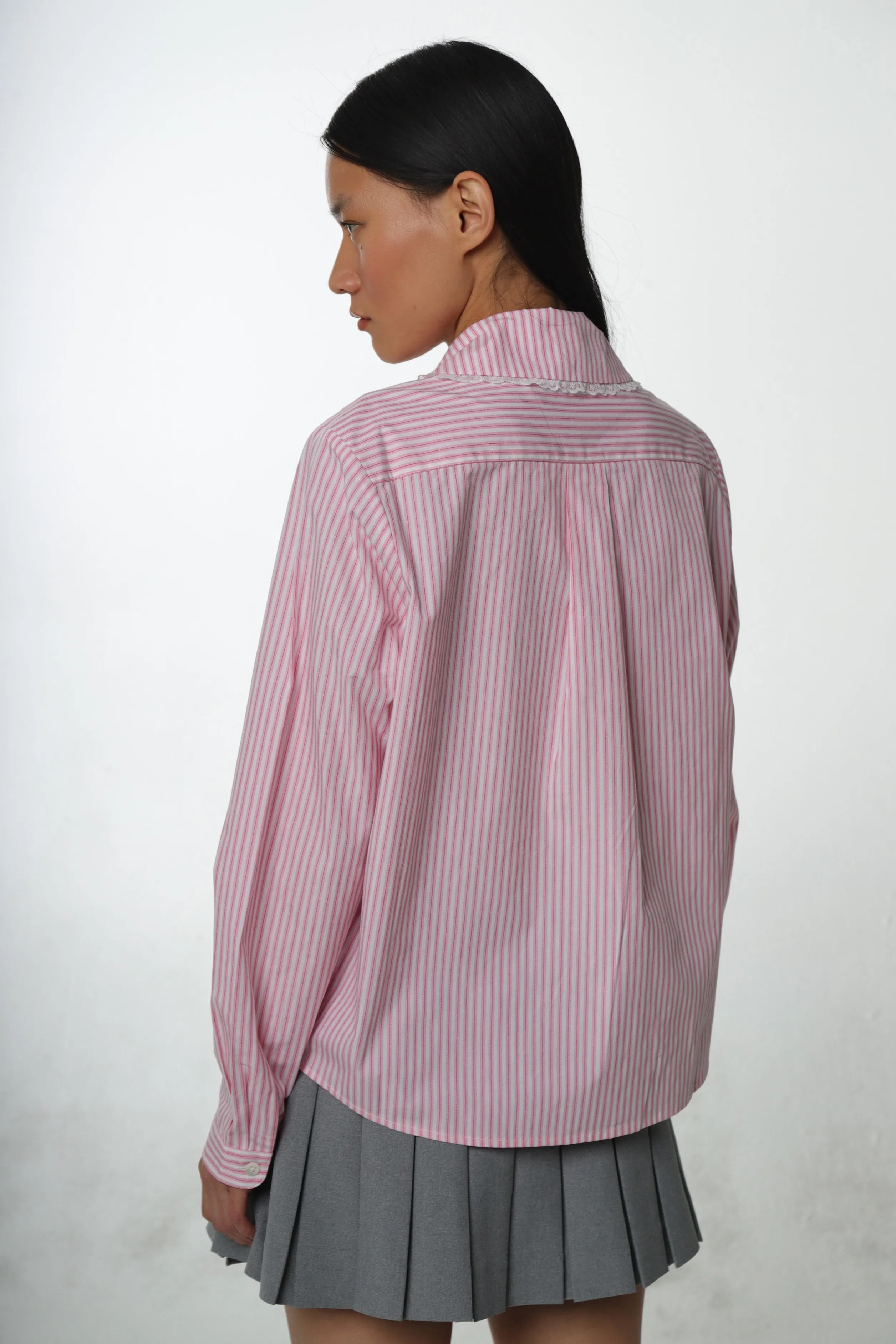 Cotton long sleeved shirt in Pink StripePeter Pan collarFeatures adjustable and removable tie Embroidery at chest pocket