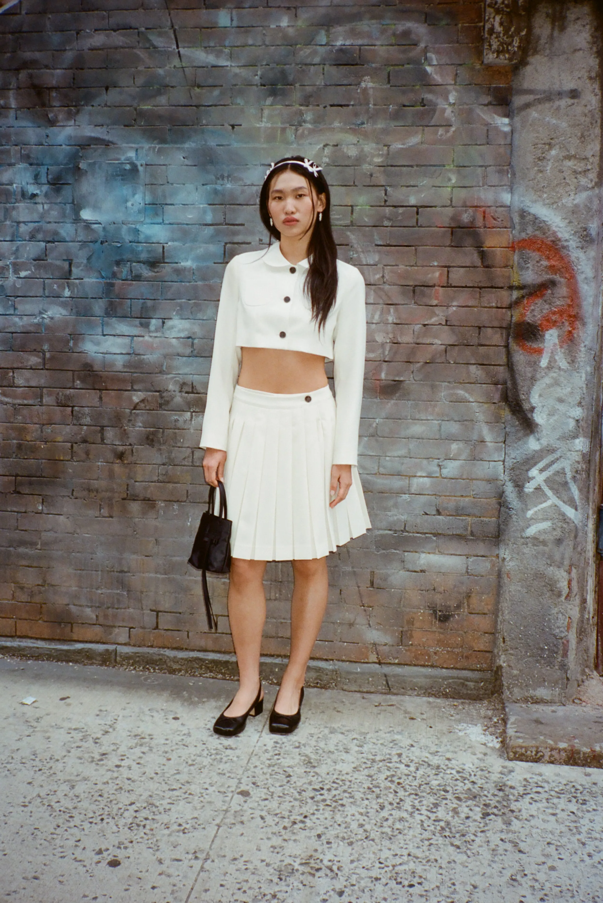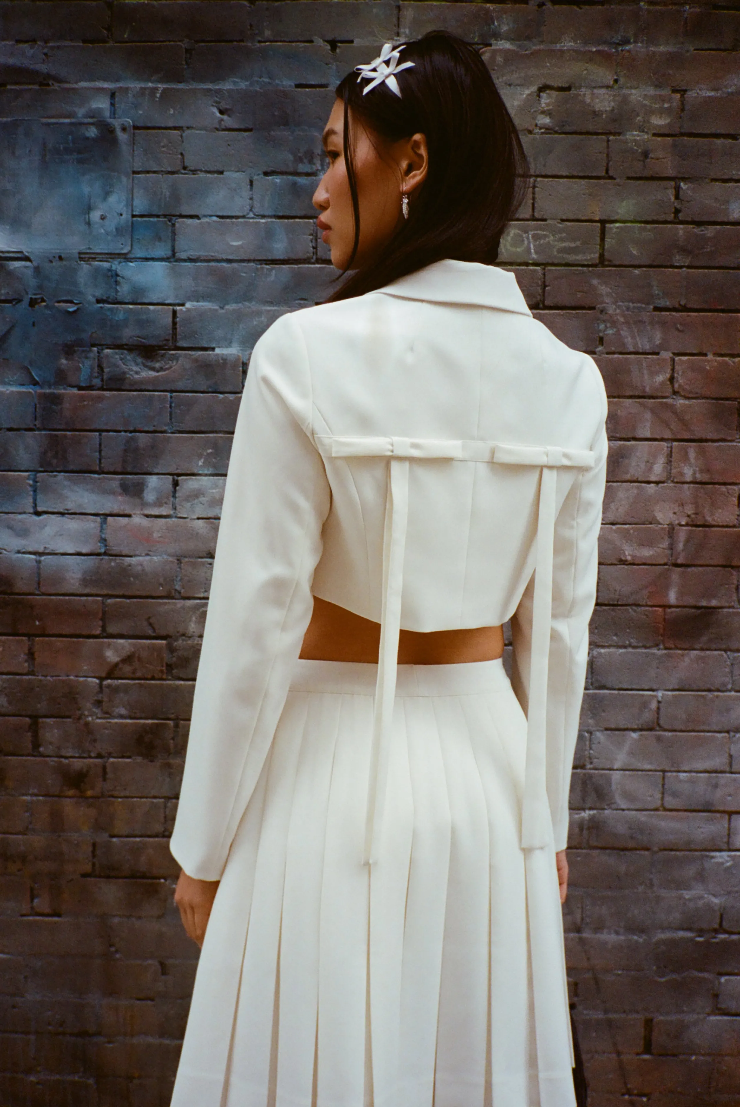 Cropped tailored jacket in Bone mid weight suiting Long bows at back Pockets at chest Button closure Fully lined Made in…