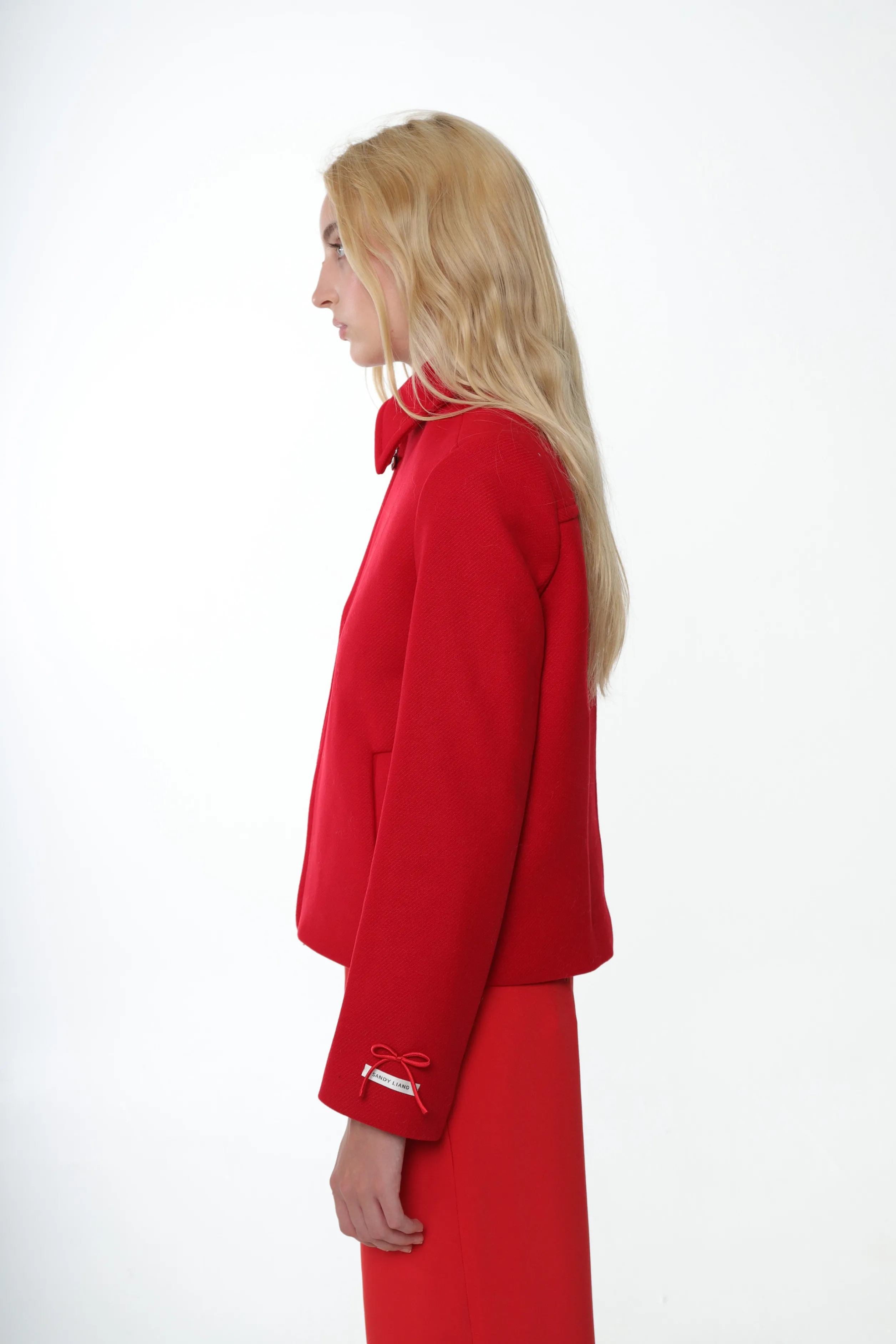 Tailored jacket in Red Melton Bow and logo detail at cuffFully lined Made in NYC