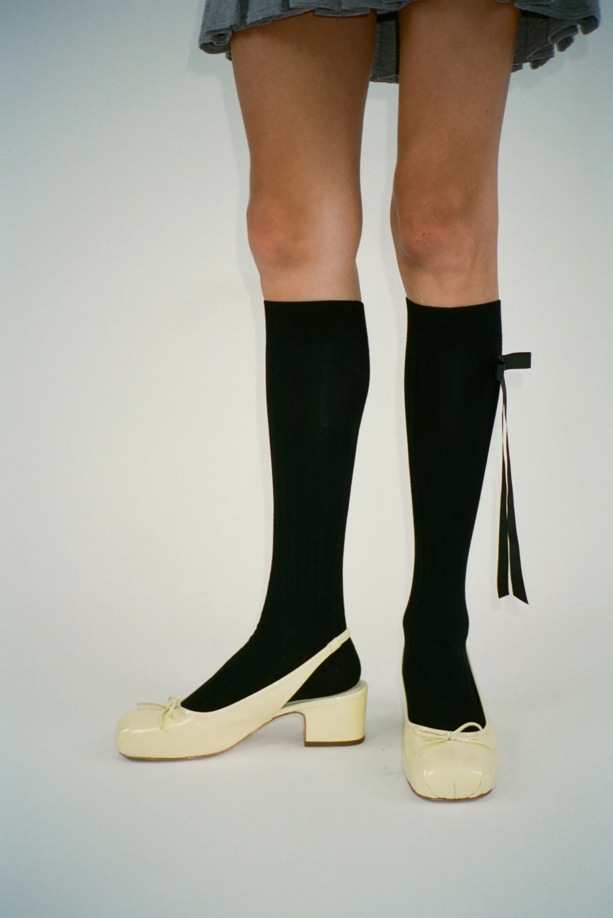Cotton blend knee high socks in BlackFeatures a black ribbon bow on side Made in Italy