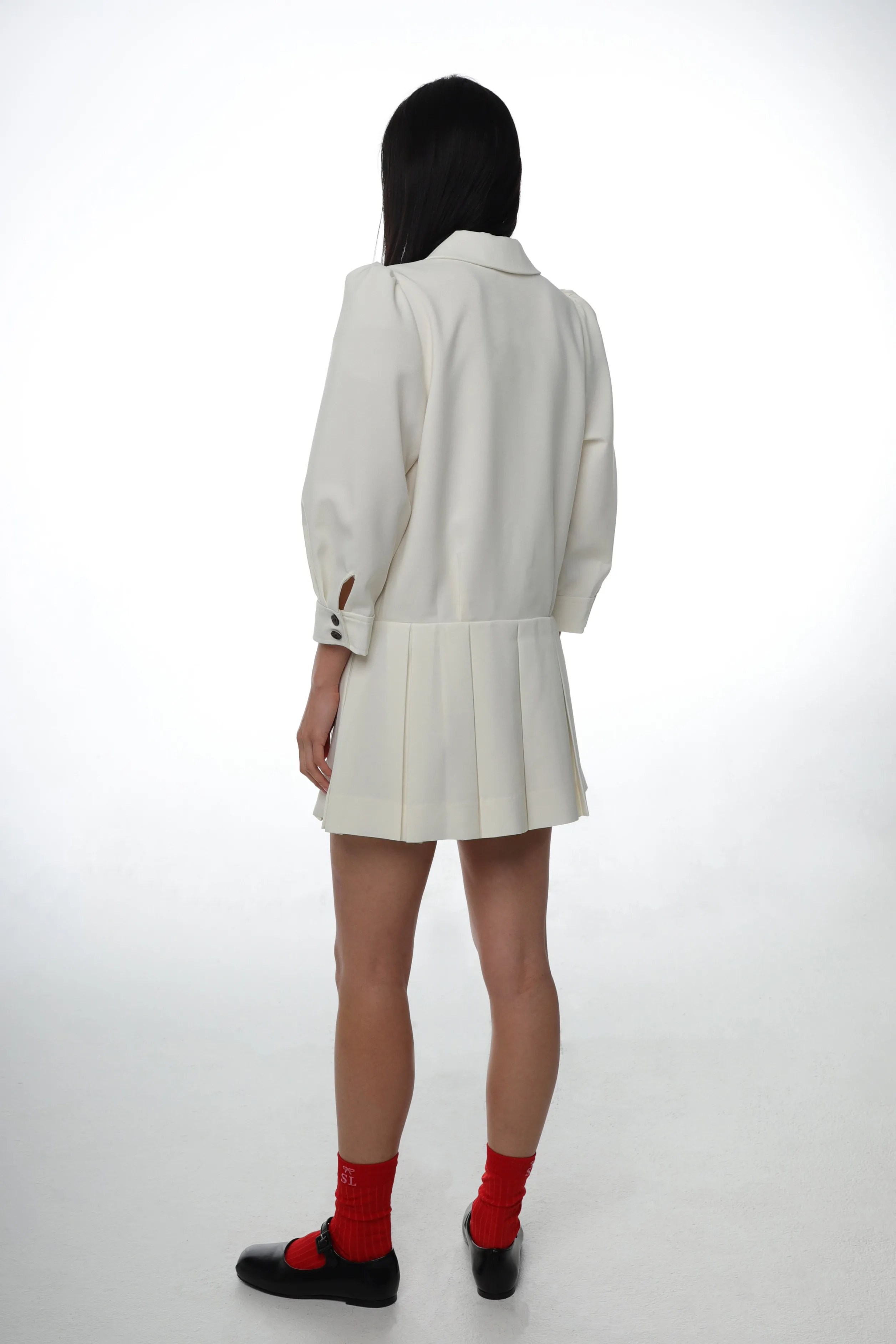 Uniform pleated mini dress in Cream SuitingPeter pan collar with a slightly dropped waistFeatures a puff sleeve and ches…