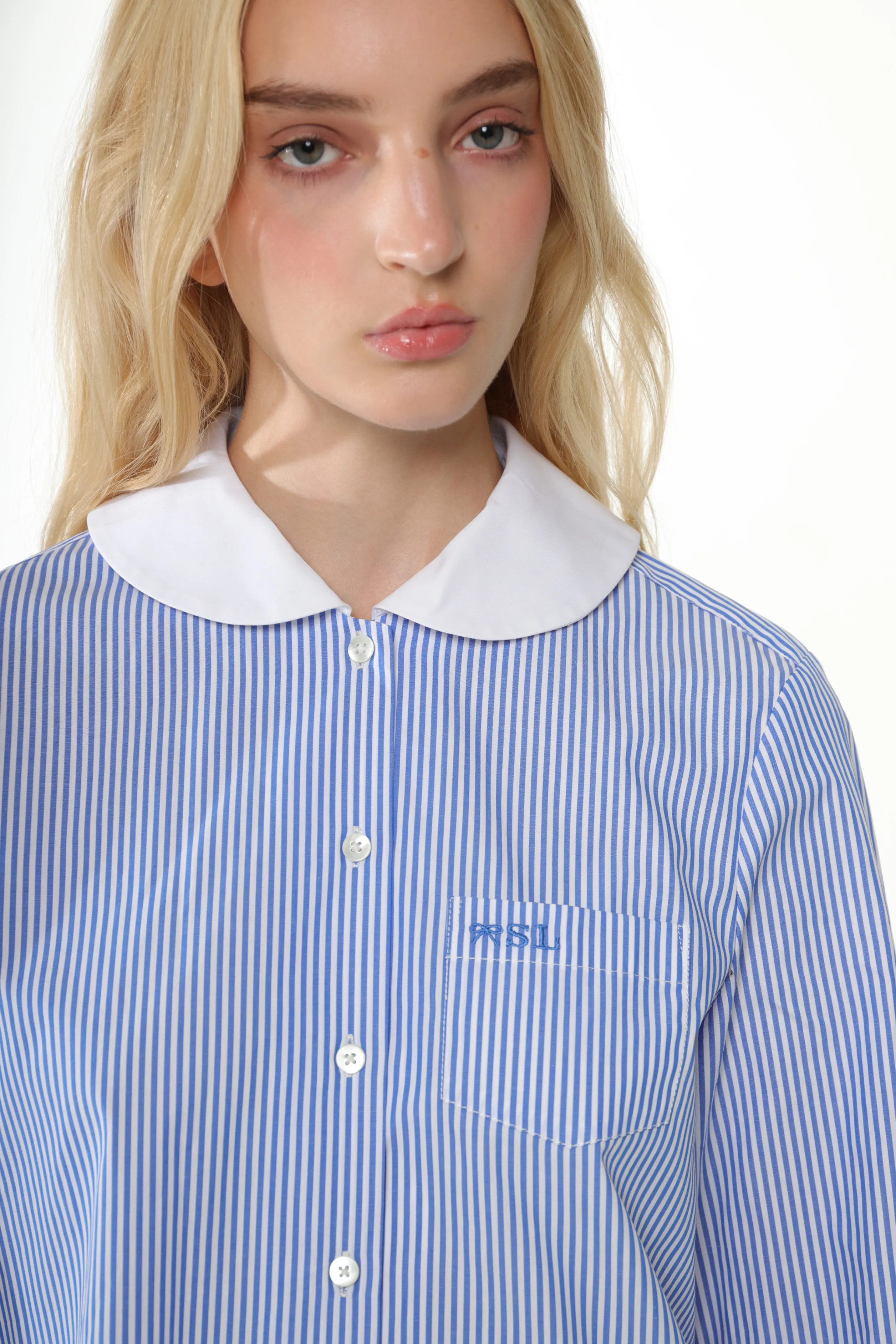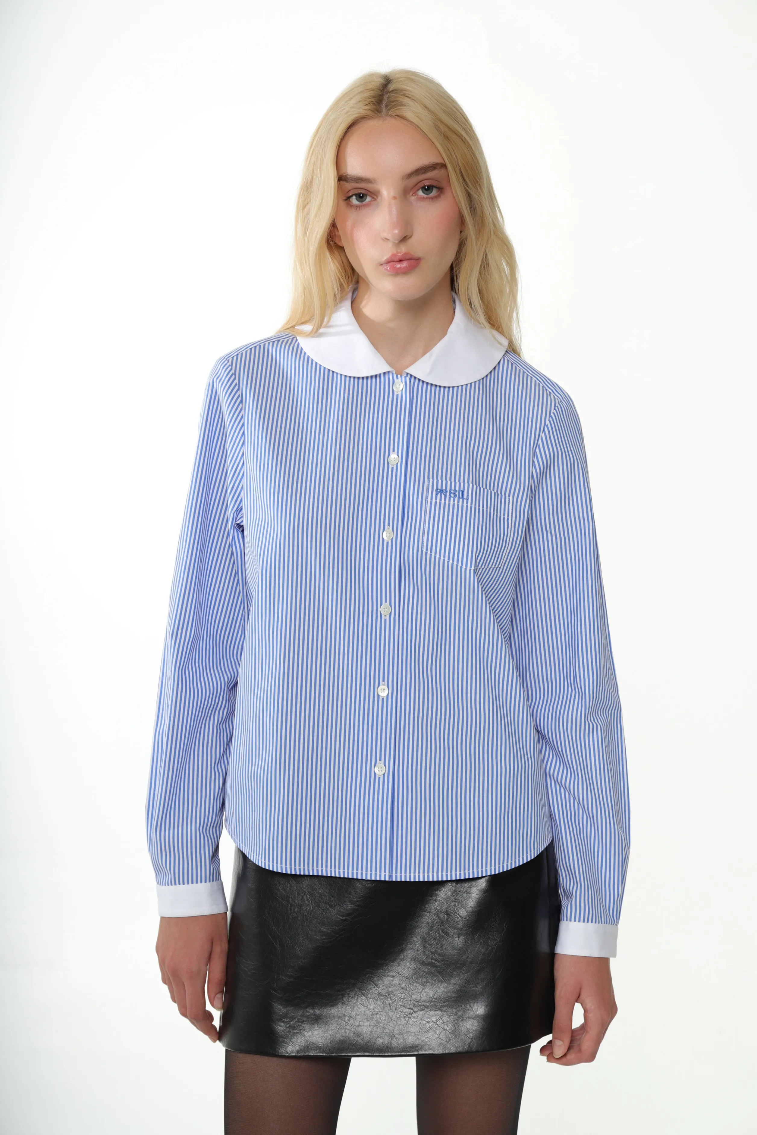 Cotton long sleeved shirt in Blue Multi StripeContrast Peter Pan collar and cuffsEmbroidery at chest pocket